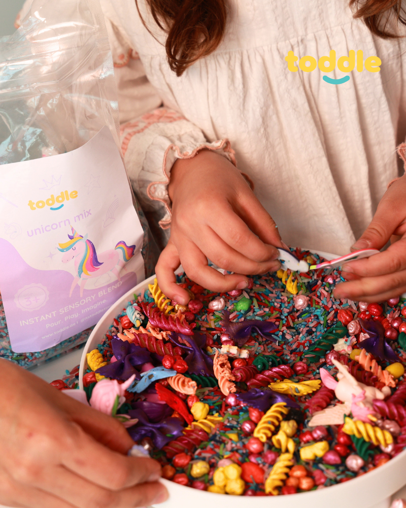 Pour our sensory blend into a tray, add your own toys and various other scoopers, critters and mixes from around your house or nature to create your own Unicorn small world play tray and enjoy endless hours of play.